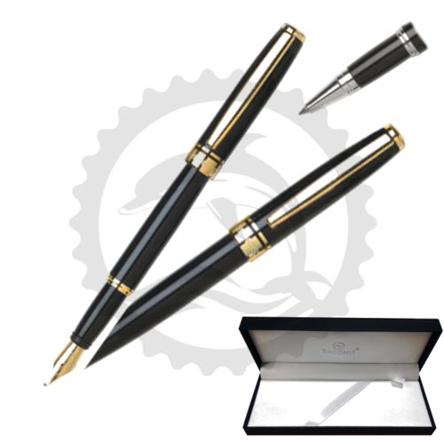 SABONIS JUEGO DE BOLIGRAFOS 2 PIEZAS MAS ESTUCHE VIVOS PLATA/ORO ROLLERBALL + FUENTE - [ almacen 2 ]