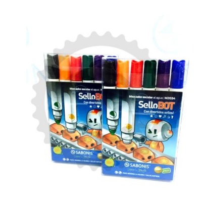 Código: M-2034 Marcadores SelloBOT. Tinta a base de agua con doble punta. Una de trazo regulable y punta redonda y la otra